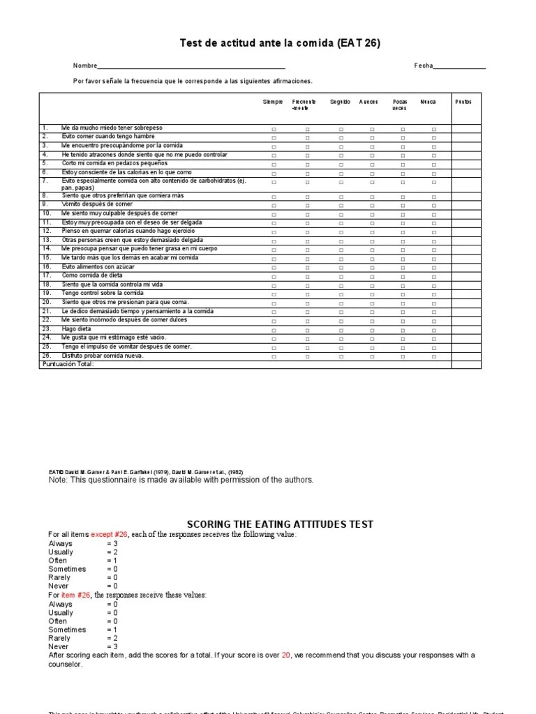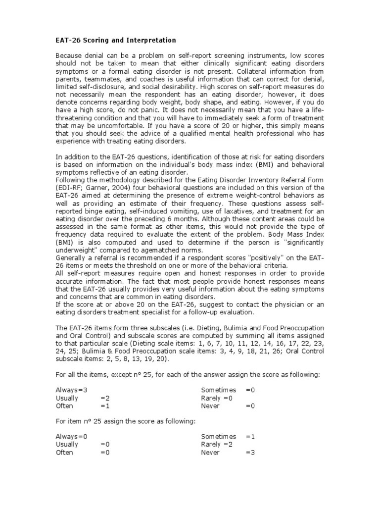 Eat 26 Scoring - Web scoring the eating attitudes test for all items except #25, each of the responses receives the following value: This is a screening measure to help you determine whether you might. Follow the 5 steps below: