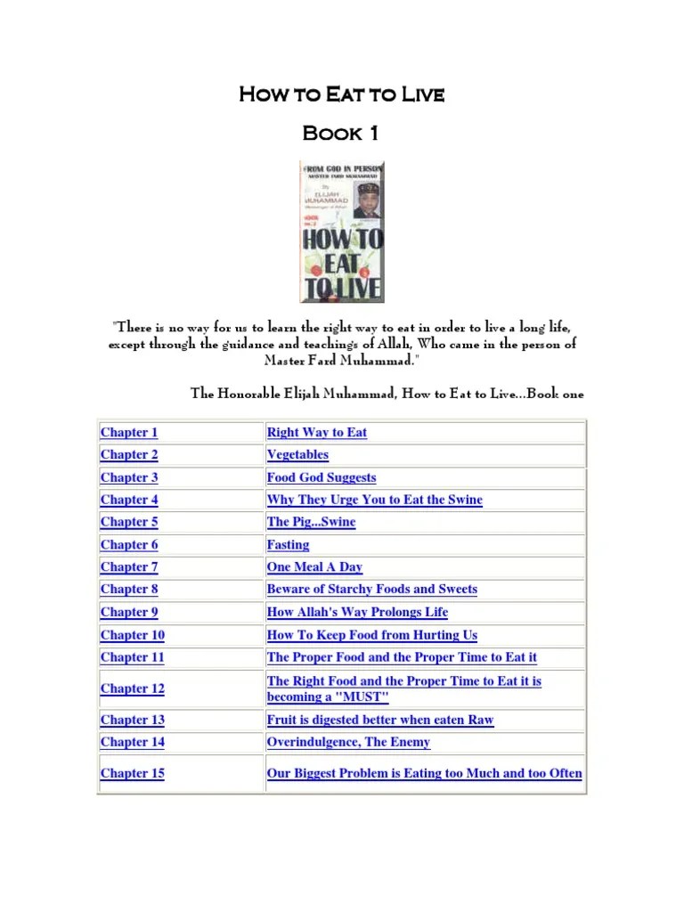Jan 1967· elijah muhammad books.com. Web how to eat to live book 1. Web how to eat to live is a series of two books published by nation of islam leader elijah muhammad in the 1960s, which are still in.